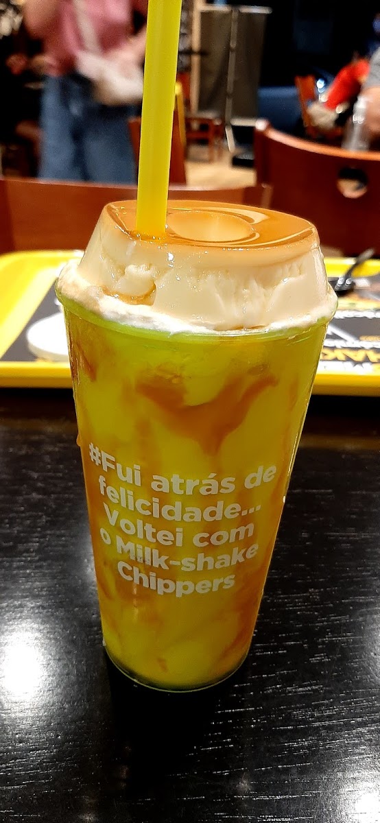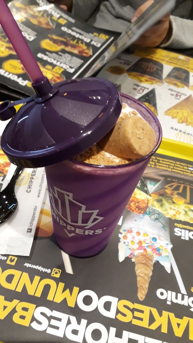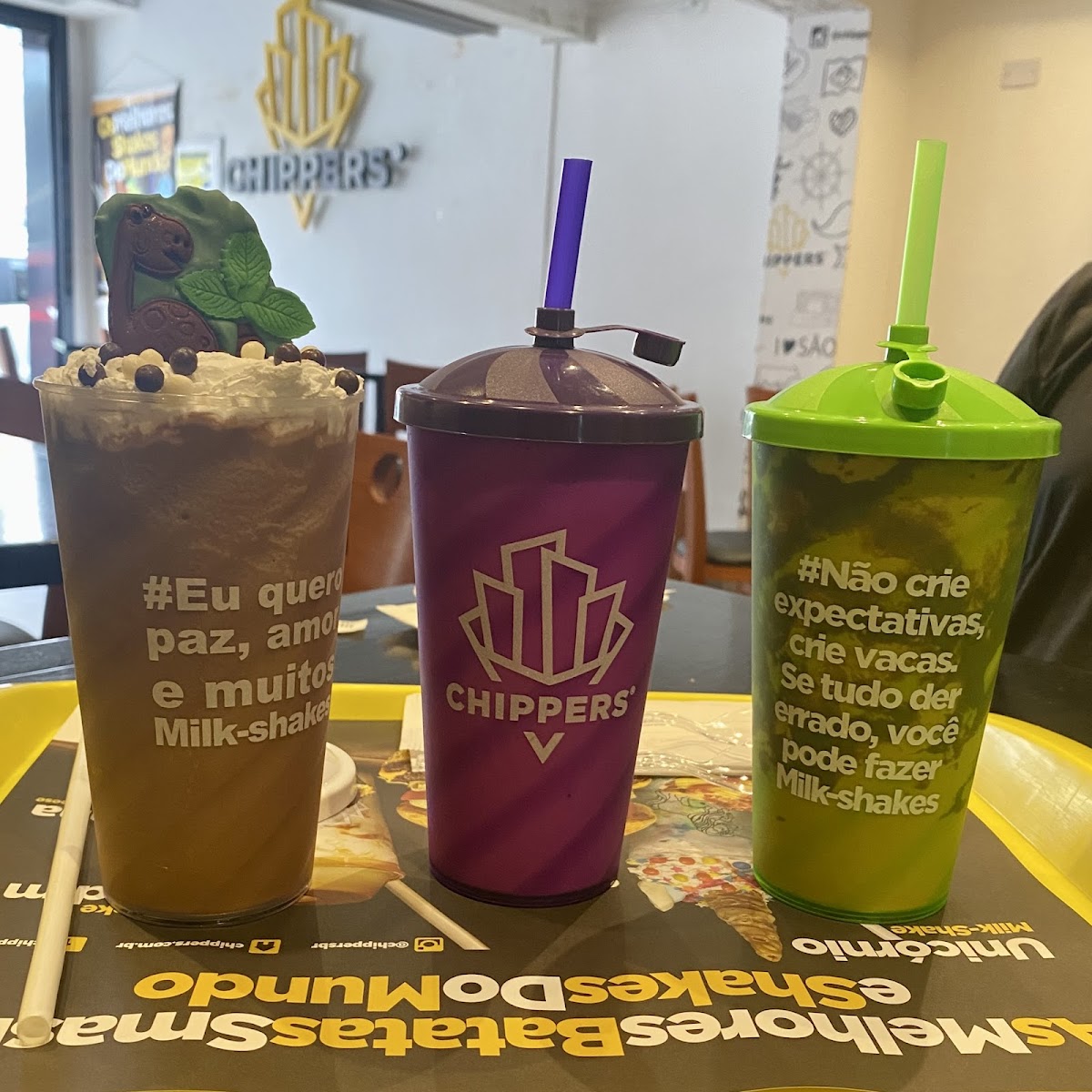 O que falar desse milkshake que eu mal conheço e considero pacas? Parabéns a todos os envolvidos, do fundo do meu coração, parabéns. Fazia tempo que eu não me impressionava assim com um milkshake, pra falar a verdade eu não sou o maior especialista, mesmo assim acredito que consigo identificar quando algo é feito com gosto. Não tive o prazer de provar as batatas (ainda) porém se elas seguirem a mesma linha de qualidade dos shakes, muito provavelmente não vão decepcionar. Sempre que pedir um shake, você terá uma Gama de seis ou oito copos com cores e frases diferentes para escolher, eles ficam com você depois de tomar também!!! (até lavam o copo pra você) Até o dia em que eu postei essa avaliação eu fui três vezes ao Chippers Aclimação, esses foram os meus pedidos: Milkshake de Brownie (vem com um pedação de Brownie em cima e muuuitos pedaços pequenos dentro) Milkshake de base gourmet leite ninho com Nutella (eu não sou o maior fã de Nutella do mundo porém eu fiquei maravilhado com esse do mesmo jeito) Milkshake de base gourmet leite ninho com paçoca (esse tem a mesma base do de Nutella porém, como dito anteriormente, eu não gosto muito de Nutella, pedi para fazerem um mix de dois shakes diferentes com um pé atrás mas a ideia foi aceita com bom grado!) OBS: esse é meu favorito até então.